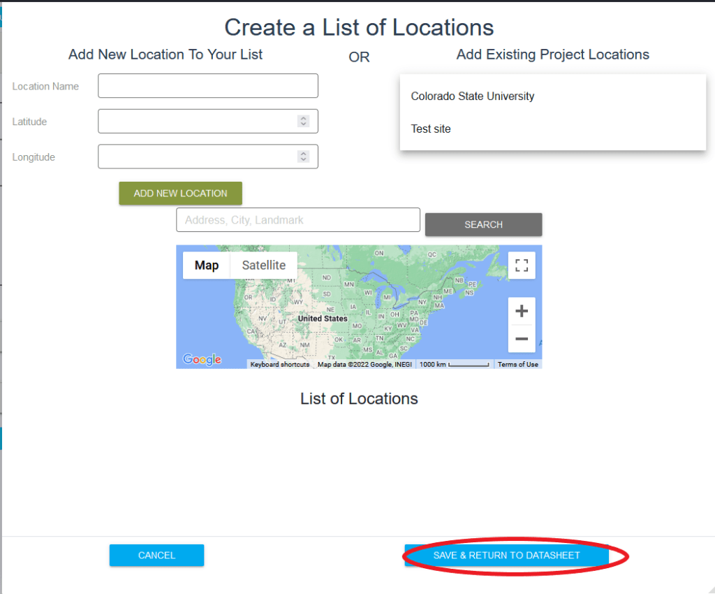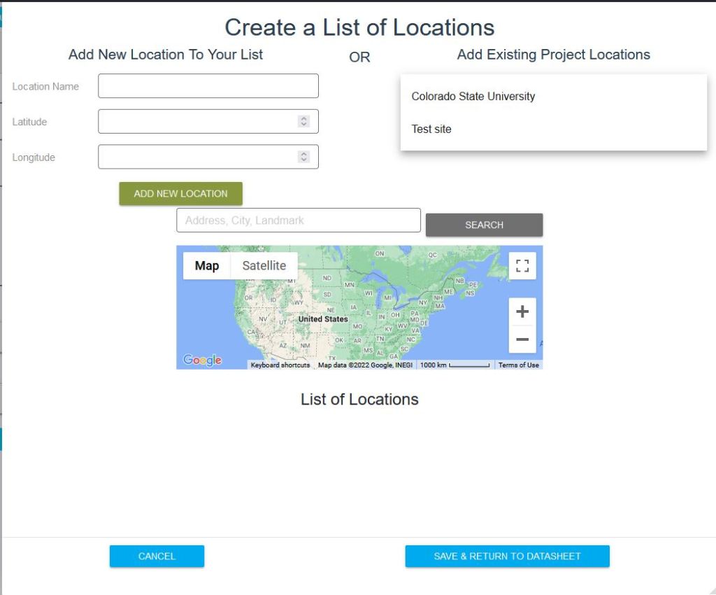 This will bring you to the “Create a List of Locations” popup screen where you can create a new location by inputting the location name, latitude and longitude. Alternatively, you can add an existing location to your datasheet by choosing from the dropdown list.
