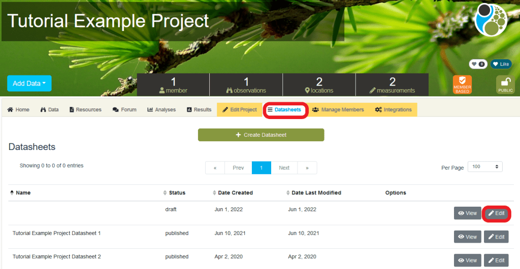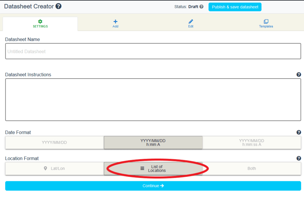 From your project homepage, click on the yellow “Datasheets” tab. Select the datasheet you want to change from your list and click “Edit” and you will be directed to the Datasheet Creator screen.