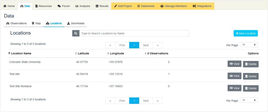 The Data tab allows you to view current data in your CitSci project. You can view a list of current observations from members, view observations using a map, or view the latitude and longitude of specific observations