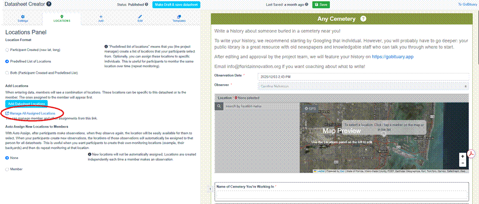 Select this if you want participants to choose from a list of sites that you create. Predefined sites are best for long-term monitoring, such as tracking the same pond, trail, or classroom aquarium over time (like our friends at Utah Water Watch, who have lists of specific lakes and streams for their volunteers to monitor, each with different datasheets). As we mentioned earlier, you can even assign specific locations to certain participants to ensure consistent coverage. Click “Manage All Assigned Locations” to navigate to that screen.