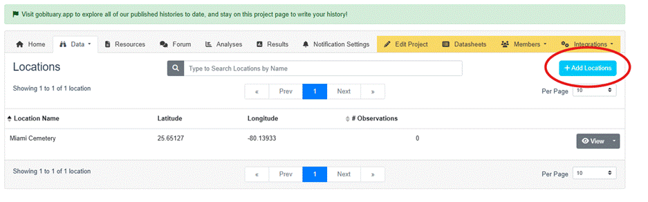 You can see all the current locations for your project – either ones you’ve specified and/or ones your participants have created – once you click “Locations” under the “Data” dropdown, on your project’s page.