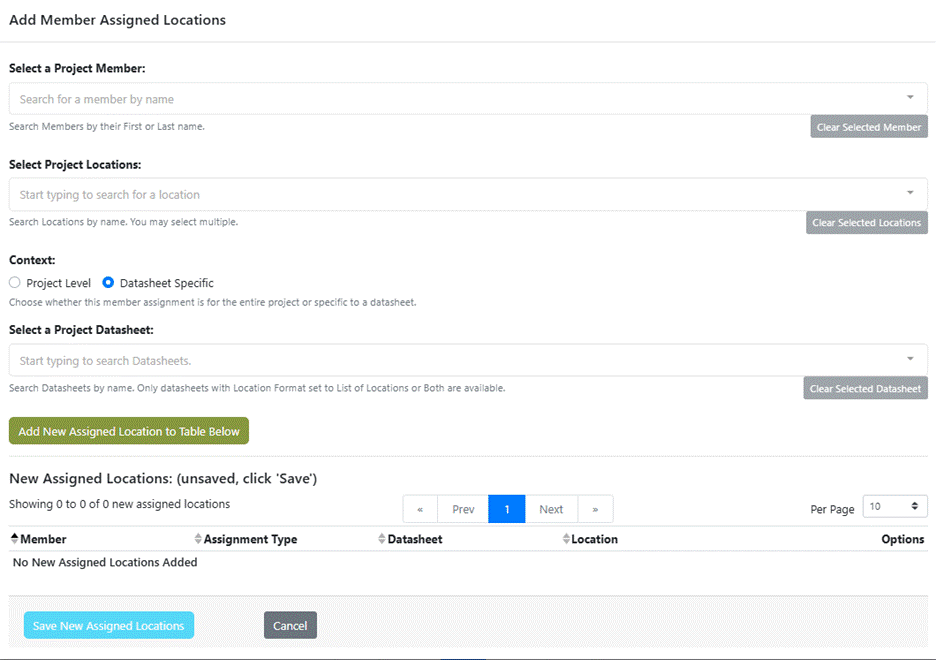This opens a pop-up where you can assign the locations to members either at the project or datasheet level: