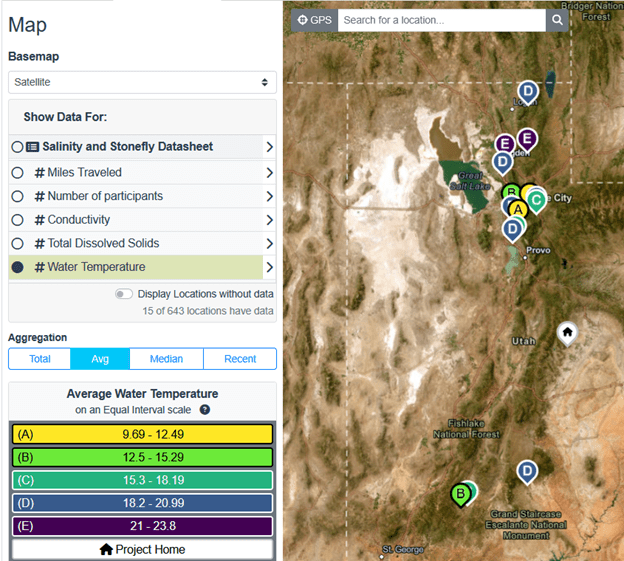 A map of average water temperature, a numerical variable, from the Utah Water Watch project.