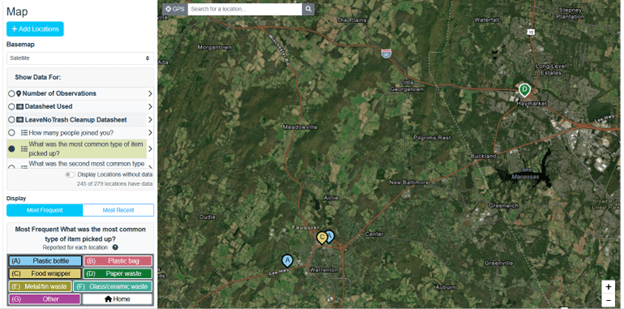 In this example, let’s say we’re looking at data from the Leave No Trash project led by Leave No Trace. You can select the LeaveNoTrash Cleanup datasheet from the legend and then further select which datasheet question you’d like to explore. Here we selected the LeaveNoTrash Cleanup Datasheet and the question, “What was the most common type of item you picked up?”