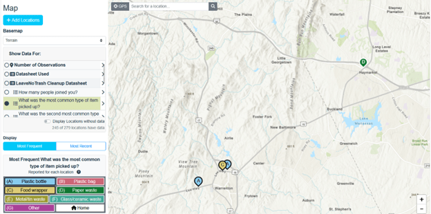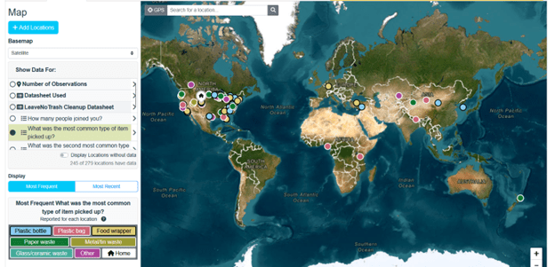 The Leave No Trash map page showing display of the most common type of item picked up. Each observation location shows a colored map marker that corresponds to each distinct category of item picked up (plastic bottle, plastic bag, food wrapper, paper waste etc.)