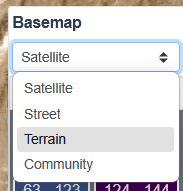 - Look at the four basemaps (Satellite, Terrain, Street, Community)