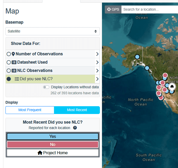 Zoomed in map of observations from NASA’s Space Cloud Watch project with map markers representing the number of observations with colors and symbols. You can easily notice that the location in Utah has had more observations (2-6) than the other locations shown.