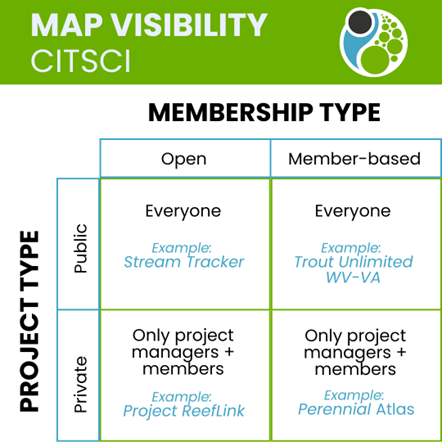Chart showing the visibility of maps based on project privacy and membership settings, with examples that link to each type.