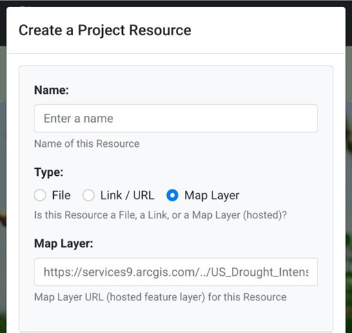 - Select the type of resource to add (File, Link / URL, Map Layer).