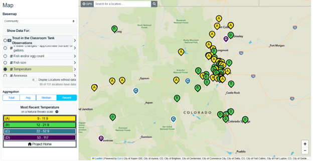 Map of Trout Unlimited’s Trout in the Classroom project showing the numerical variable Temperature.