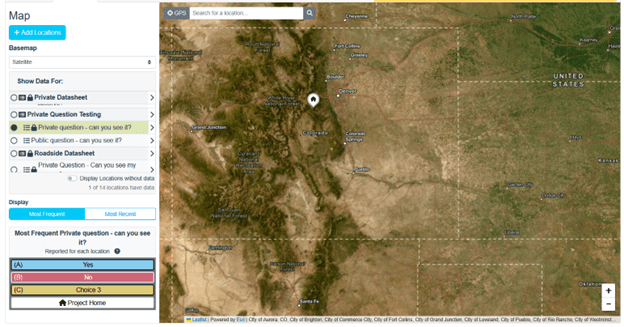 Private questions are treated in the same way as private datasheets. If a project is Public and either Open or Member-based, everyone can see the maps and the map markers on the maps for the public datasheets. In the example below, there is a datasheet called “Private Question Testing” that has two questions, one is a public question and one is a private question. For demo purposes, we’re labeling these questions “Private question – can you see it?” and “Public question – can you see it?”