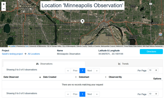 When someone clicks on the gray View button for that observation, they are taken to the map marker location, where the location name is visible but no other data can be viewed, as demonstrated in the Location screen below.