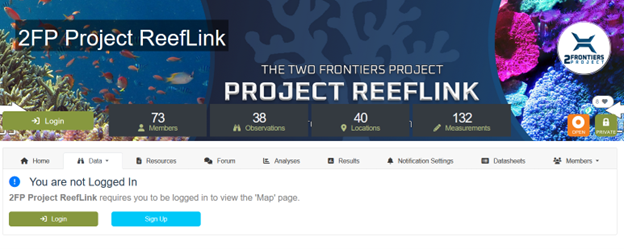 When I try to navigate to Project ReefLink led by the Two Frontiers Project, I receive a message letting me know I cannot view the map until I am logged in. I would also need to be a member of this project to see the map.