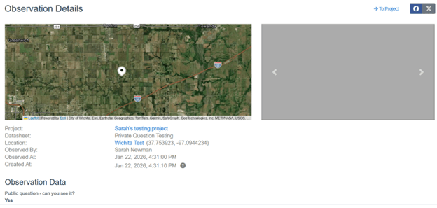 If you click on the map marker and it happened to have an answer for the Private Question, you won’t see any data for it. In the example below, I know that I answered the private question and the public question for this particular location. If I log out of my account and try to view the observation as a general user, when I click on it and follow it through to see the data, I can only see the answer to the public question.