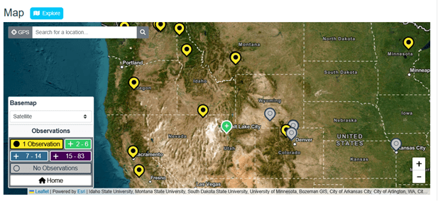There is a blue Explore button next to Map on the project home page. The Explore button takes you to the Map page (a more detailed map; also linked under the project’s Data Tab). This map page allows you to explore project data even further (see the Map – Data Tab section below for more details).